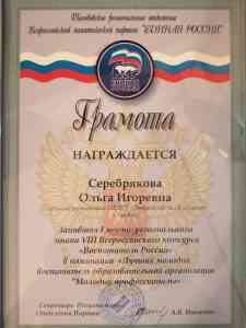 Поздравляем Серебрякову Ольгу Игоревну с ПОБЕДОЙ в региональном этапе VIII Всероссийского конкурса «Воспитатели России» в номинации «Лучший молодой воспитатель образовательной организации «Молодые профессионалы».