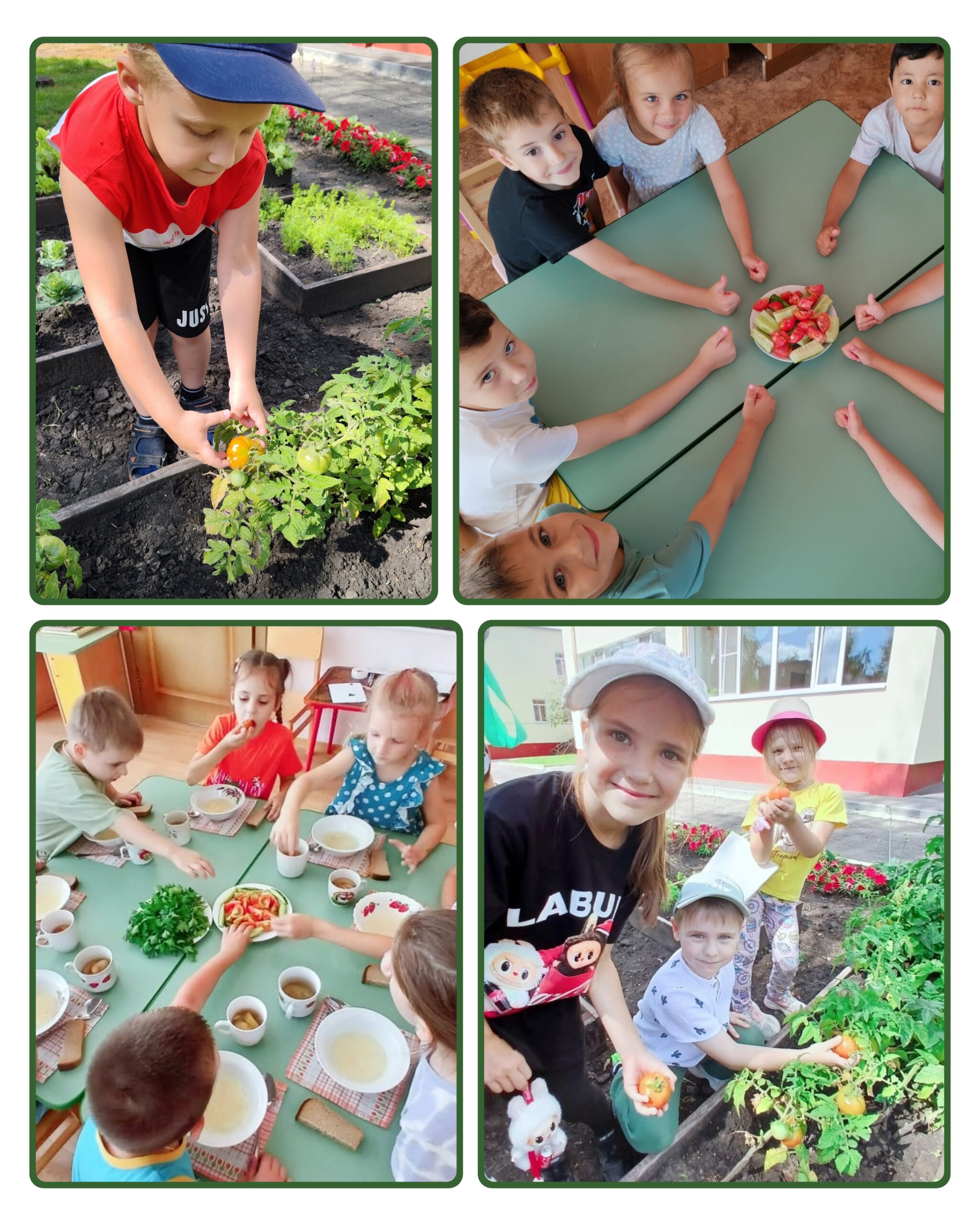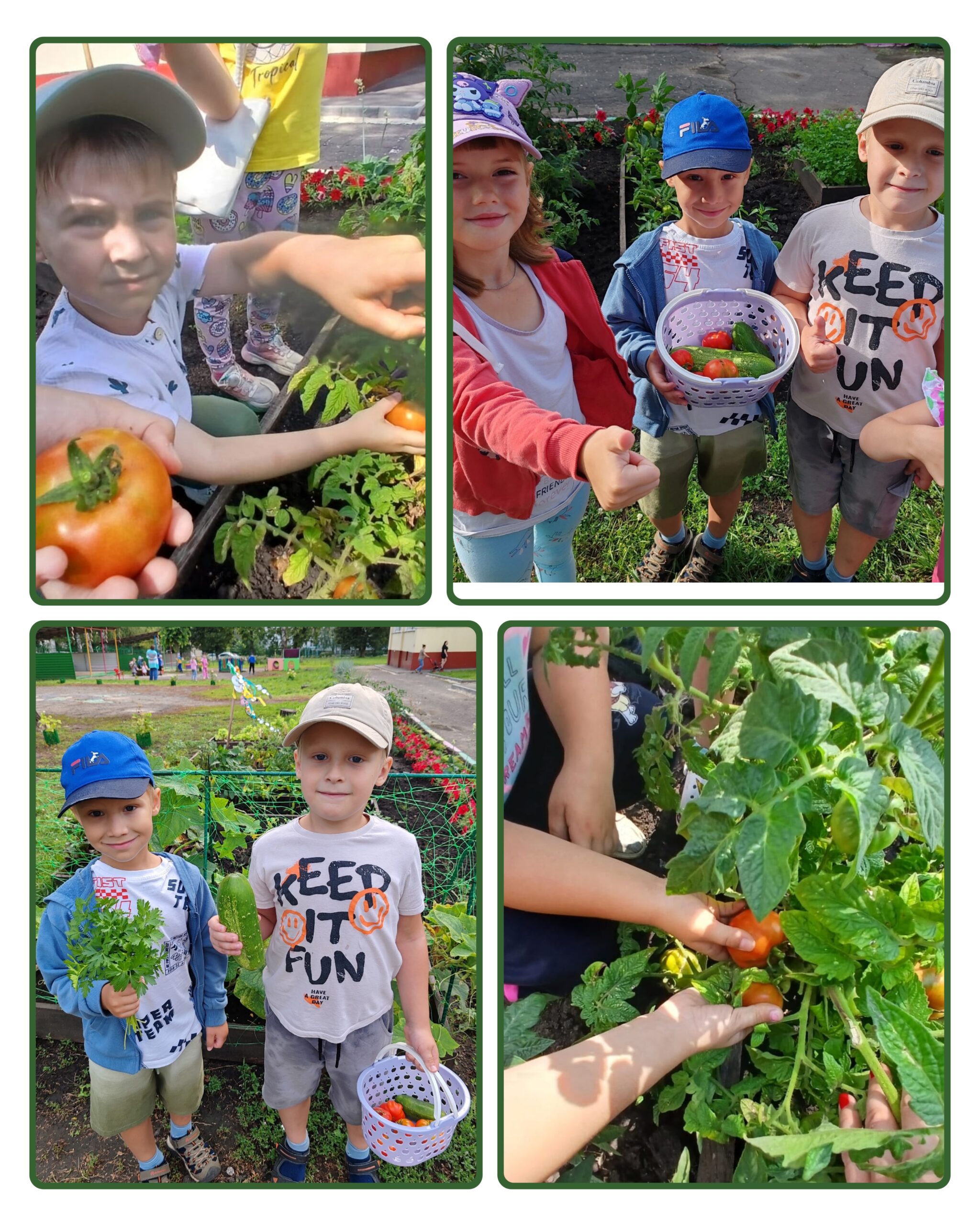 Ребята собирают третий урожай с летних грядок. В этот раз запасы витаминов пополняются вкусными и спелыми томатами.